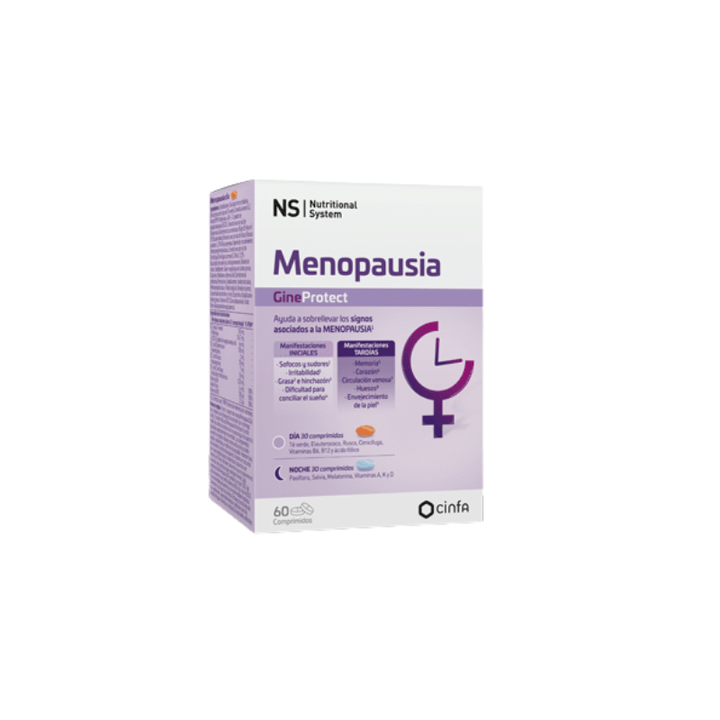 Comprimido MAÑANA contiene: EXTRACTO DE CIMIFUGA: Contribuye al alivio de las molestias de la menopausia1. EXTRACTO DE TE VERDE Y RUSCO:Ayuda a disminuir la grasa y el hinchazón. EXTRACTO DE ELEUTEROCOCO: Contribuye al apoyo mental y físico2. VITAMINAS B6, B9 Y B12: contribuyen al metabolismo normal de la homocisteína3 contribuyendo portanto al cuidado del corazón de la mujer menopáusica. Comprimido NOCHE contiene: EXTRACTO DE SALVIA: Contribuye al alivio de las molestias de la menopausia4. MELATONINA Y EXTRACTO DE PASIFLORA: Mejora la calidad del sueño. VITAMINA K2 Y D: Favorecen el mantenimiento de unos huesos sanos3. VITAMINA A: Contribuye a disminuir el envejecimiento de la piel3.Advertencias y/o riesgos